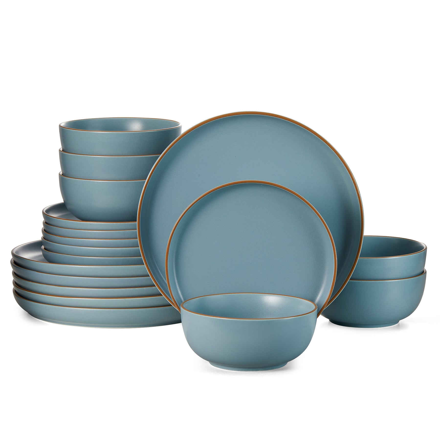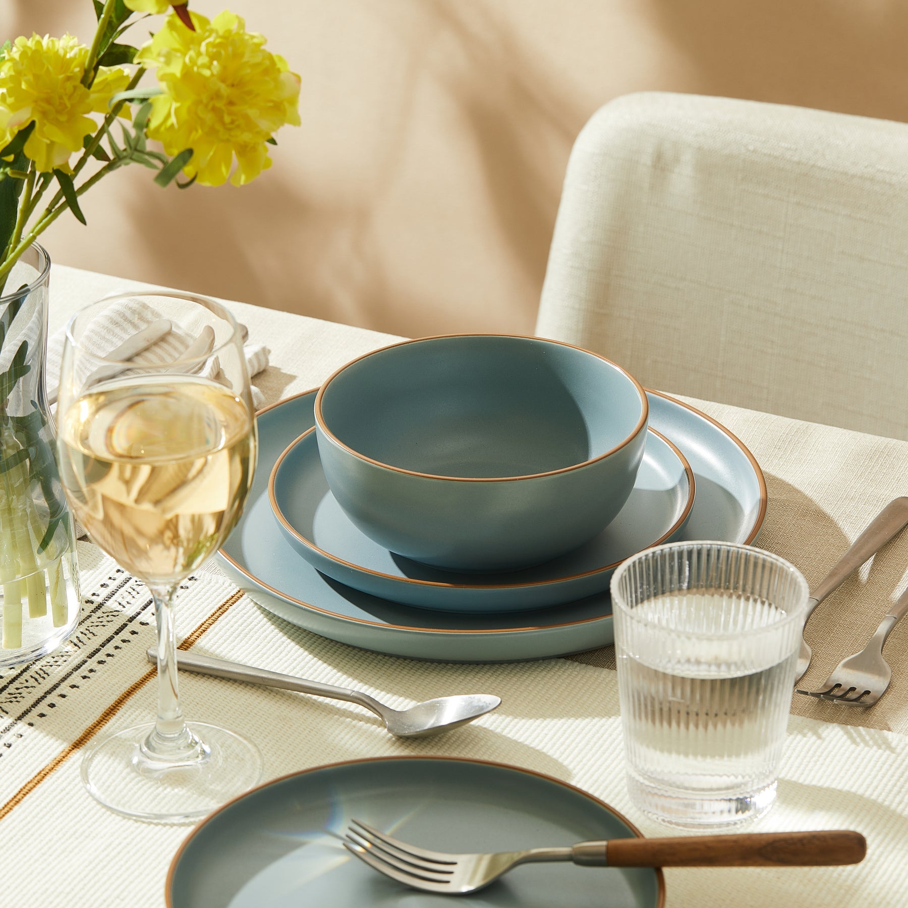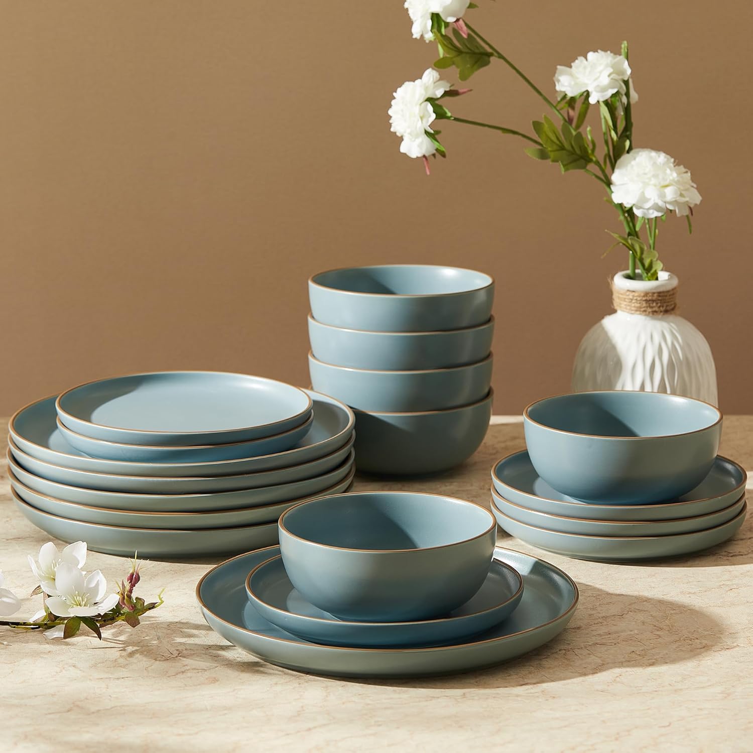 - CALM BLUE HARMONY: Blue dinnerware set features a soft matte finish paired with warm-toned hand-outlined rims, creating a subtle yet sophisticated contrast. The muted blue tone evokes a sense of calm and balance—like clear skies meeting gentle earth. Each plate and bowl embodies understated elegance, perfect for serene, modern dining spaces.